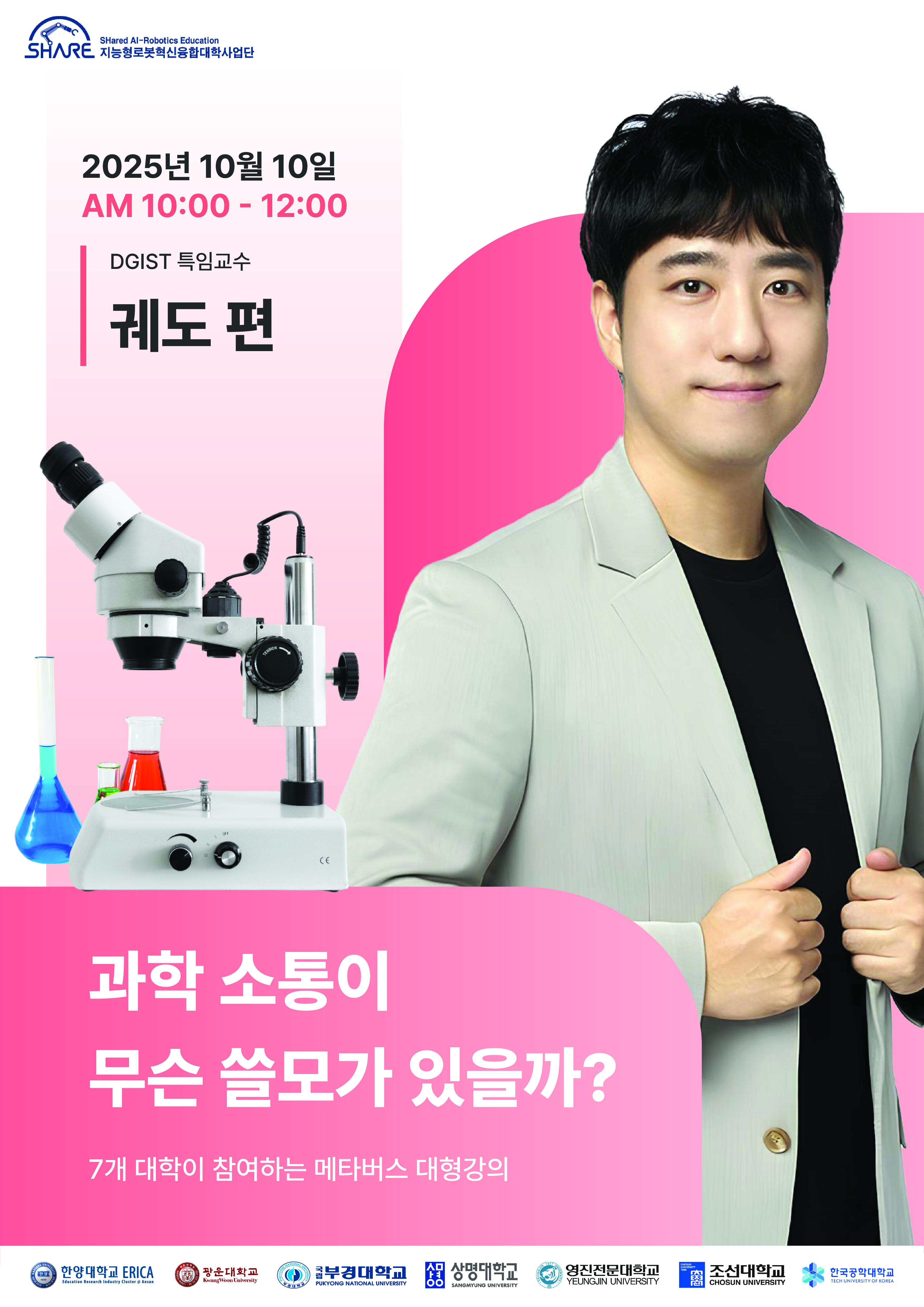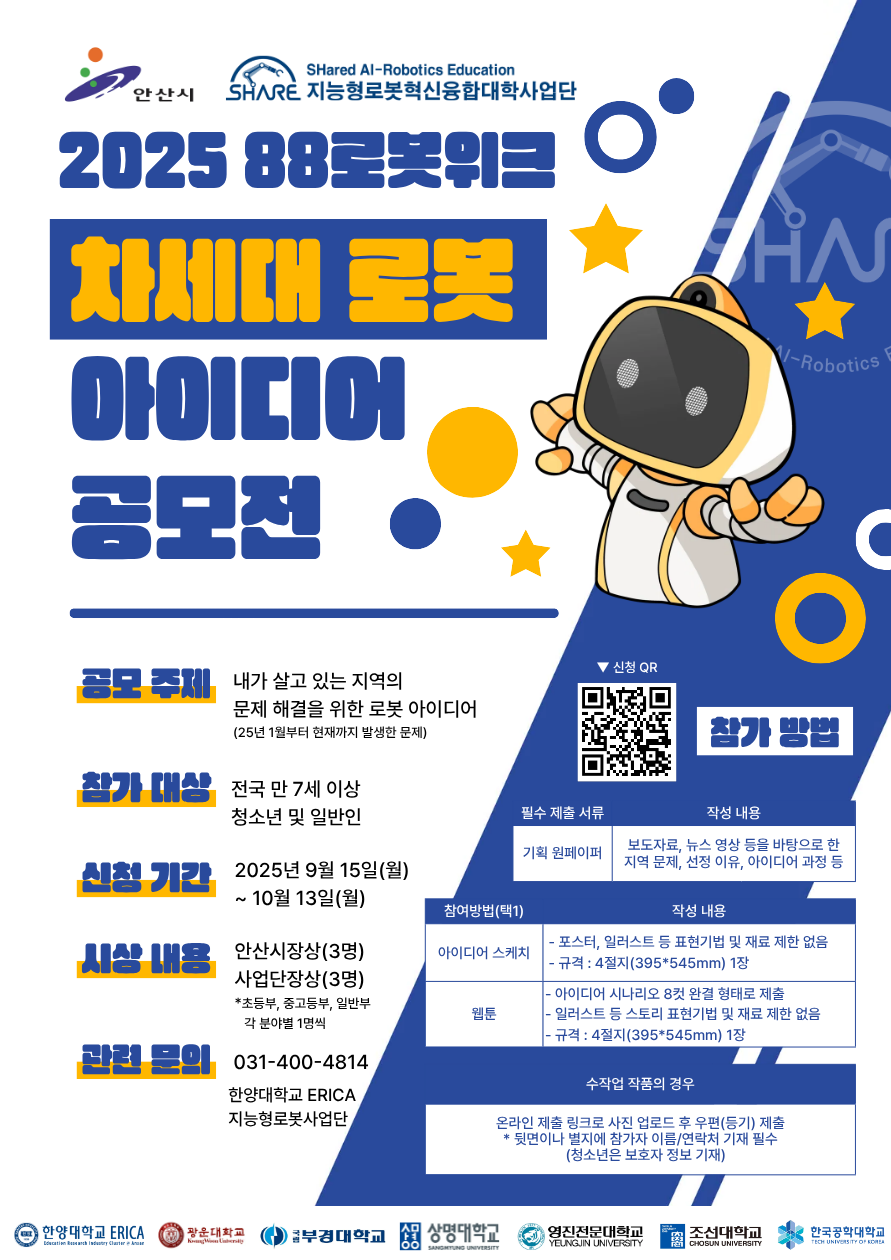 안녕하십니까,영진전문대학교 지능형로봇사업단입니다.2025 CO-Show SHARE Challenge 참가신청/선발과 관련하여아래와 같이 안내드리오니, 많은 관심과 신청 부탁드립니다.참가 자격 :2025년 캡스톤디자인 등 로봇제작 관련 교과목 이수자, 신청일 기준 재학생일정 : 1) 참가 신청 : ~2025년 10월 24일2) 예선 : 10월 30일...